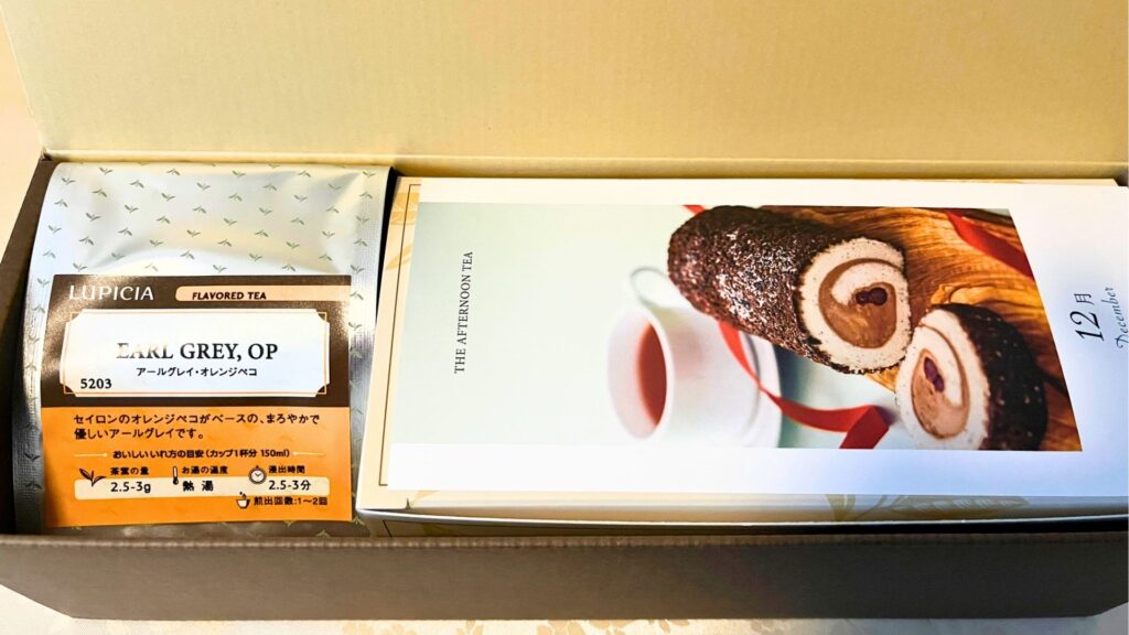 シックな雰囲気の箱を開けると、ケーキとお茶の袋が入っています。