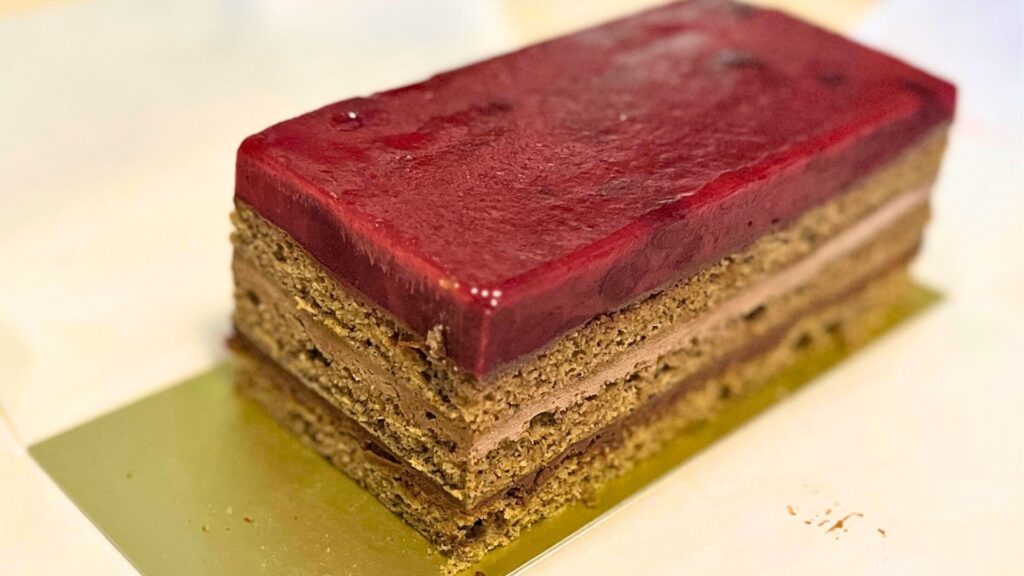天面は赤ワインのような深紅のチェリーコンポートが目を引きます。