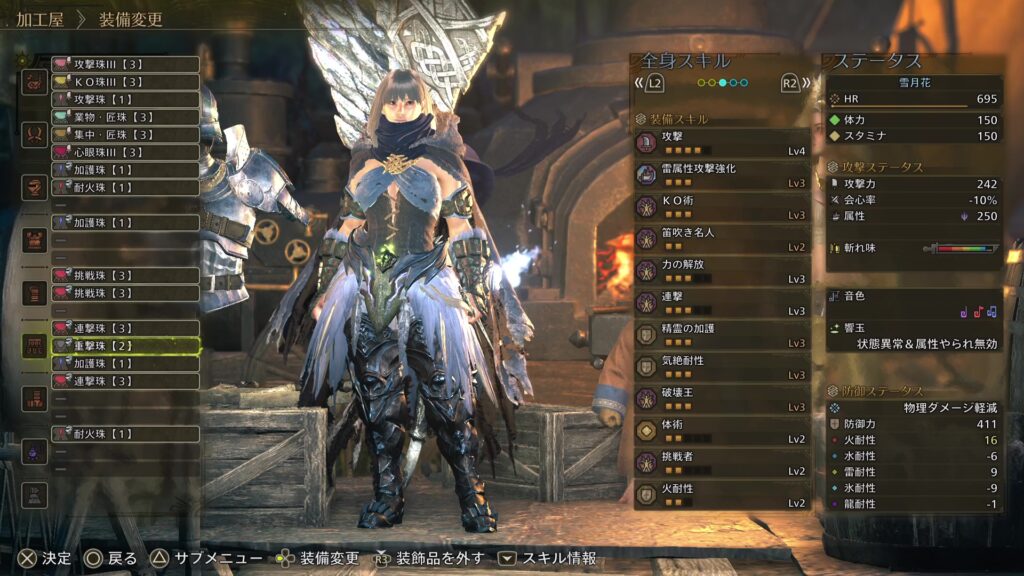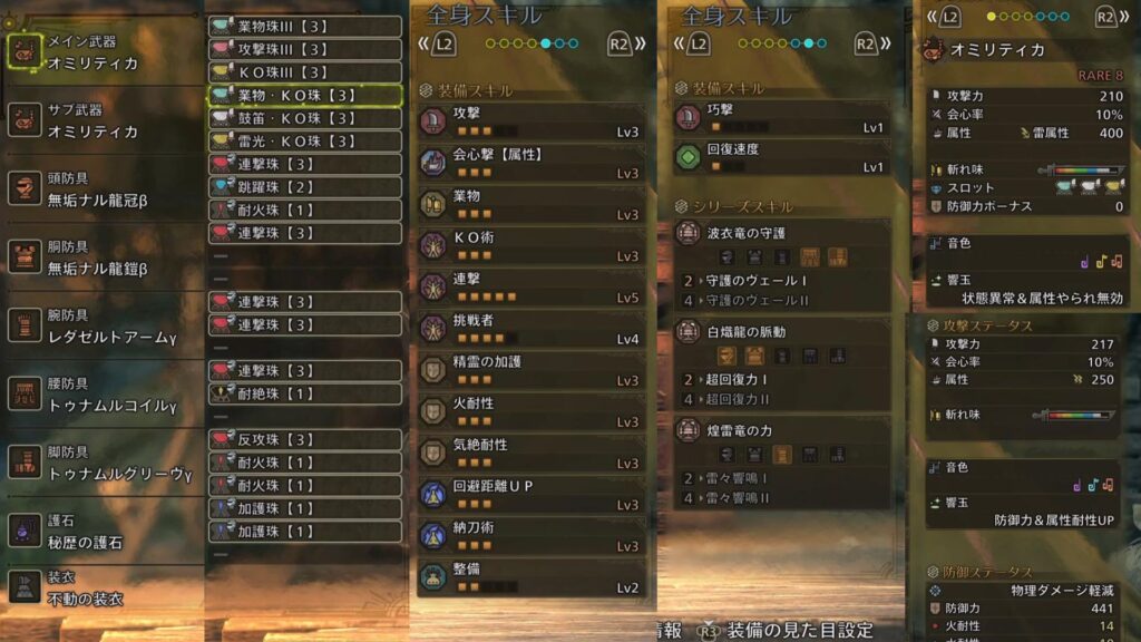 双剣は雷ティルトクライス、ガルシュハド(笛)。スタミナ系の補助は大切。スタミナ急速回復とかあると便利。